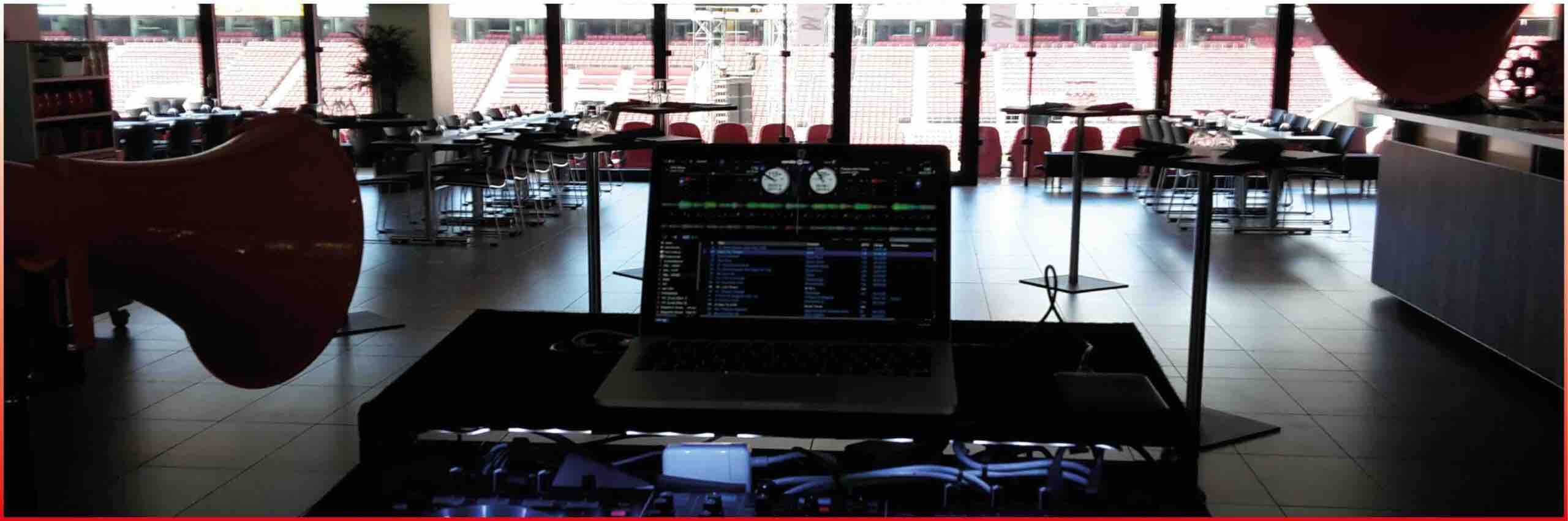 In der frisch erbauten Adler-Wirtschaft wurde es zunächst etwas hektisch: Nachdem wir eine ganze Weile damit verbracht hatten, den passenden Platz für mein DJ-Setup zu finden, stellte sich bald die nächste Herausforderung – die Steckdose an meinem Platz war nicht aktiv und, wie man uns erklärte, an diesem Ort auch falsch installiert. Als wäre das nicht schon genug gewesen, musste ich die Stromzufuhr samt Kabel über den Rahmen der Eingangstür verlegen. Auch das Signalkabel, mit dem der Sound zusätzlich über die Lounge-Anlage laufen sollte, musste unauffällig und ohne Stolperfallen verlegt werden. Der Deutsche Bank Park bleibt anspruchsvoll, was Logistik, Parken und Equipment-Transport betrifft: Nicht überall gibt es Aufzüge – vieles muss zu Fuß und über Treppen bewegt werden.