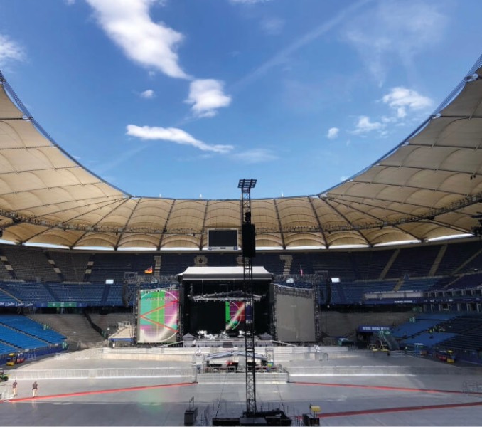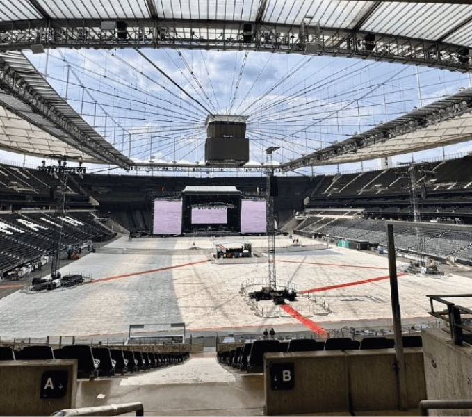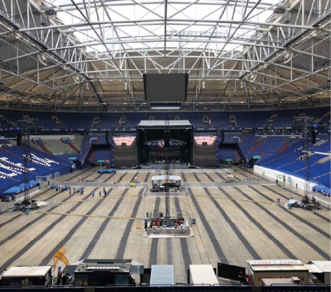 Dieses Mal hatten wir die Gelegenheit, nach der Show dem Abbau zuzusehen – ein faszinierender Einblick in den enormen Aufwand, der für solche Events betrieben wird. Oft werden Stadien, wie hier, komplett mit speziellen Veranstaltungsböden ausgelegt, um den Rasen zu schützen. Denn nicht alle Arenen verfügen über eine ausgeklügelte Technik wie beispielsweise in Gelsenkirchen, wo der Rasen einfach in den Außenbereich des Stadions gefahren werden kann.