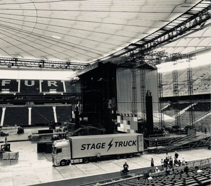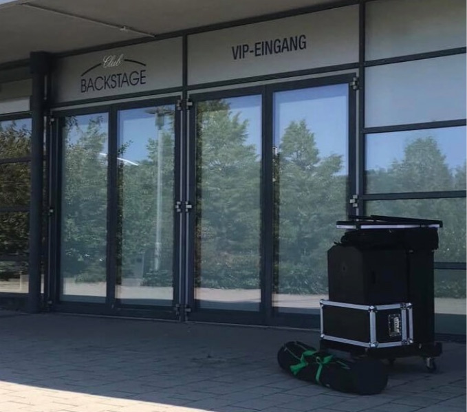 Wie bei vielen unserer Auftrittsorte gewohnt, hatten wir wieder das Privileg, in der Tiefgarage des Stadions zu parken – ein kleiner, aber feiner Vorteil, der den Aufbau erheblich erleichtert.