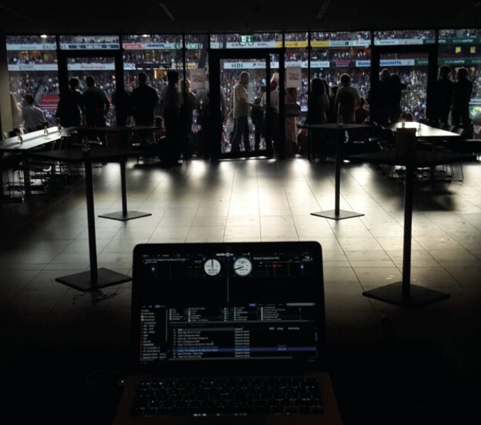 In der frisch erbauten Adler-Wirtschaft wurde es zunächst etwas hektisch: Nachdem wir eine ganze Weile damit verbracht hatten, den passenden Platz für mein DJ-Setup zu finden, stellte sich bald die nächste Herausforderung – die Steckdose an meinem Platz war nicht aktiv und, wie man uns erklärte, an diesem Ort auch falsch installiert. Als wäre das nicht schon genug gewesen, musste ich die Stromzufuhr samt Kabel über den Rahmen der Eingangstür verlegen. Auch das Signalkabel, mit dem der Sound zusätzlich über die Lounge-Anlage laufen sollte, musste unauffällig und ohne Stolperfallen verlegt werden. Der Deutsche Bank Park bleibt anspruchsvoll, was Logistik, Parken und Equipment-Transport betrifft: Nicht überall gibt es Aufzüge – vieles muss zu Fuß und über Treppen bewegt werden.